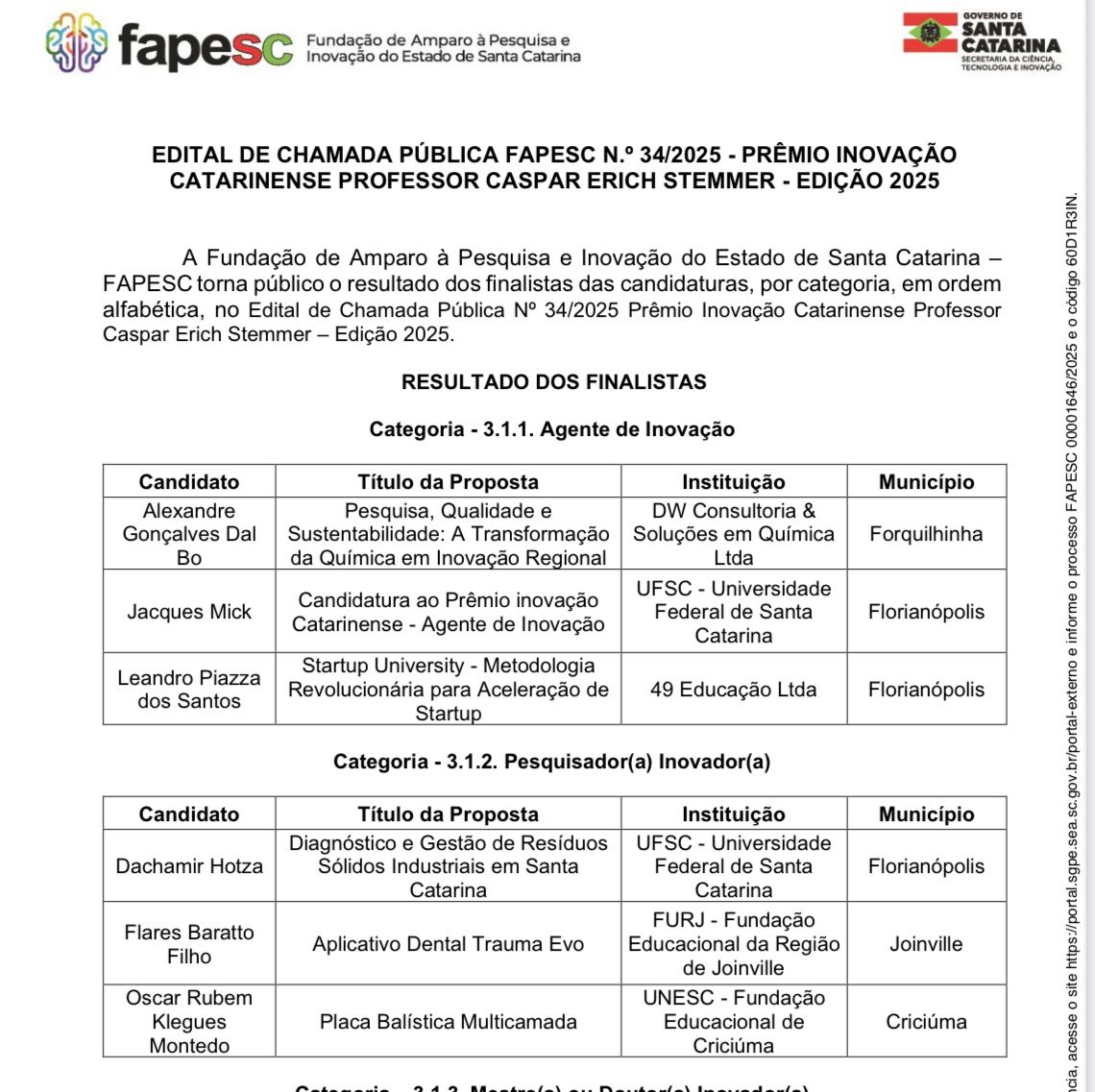 A Fundação de Amparo à Pesquisa e Inovação do Estado de Santa Catarina (Fapesc) divulgou no dia 30 de setembro de 2025, a relação dos finalistas na categoria de Pesquisador Inovador do Prêmio de Inovação Catarinense Professor Caspar Erich Stemmer – edição 2025, com a presença do professor Flares Baratto Filho entre os 3 finalistas ao Prêmio.